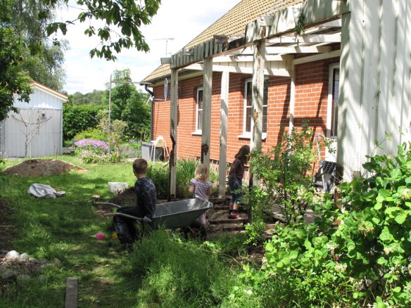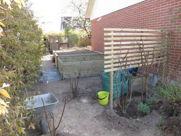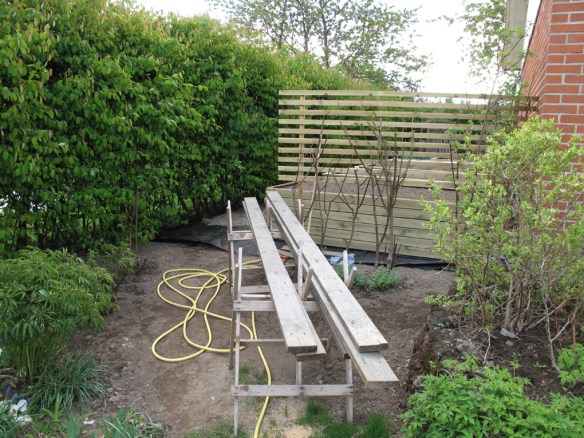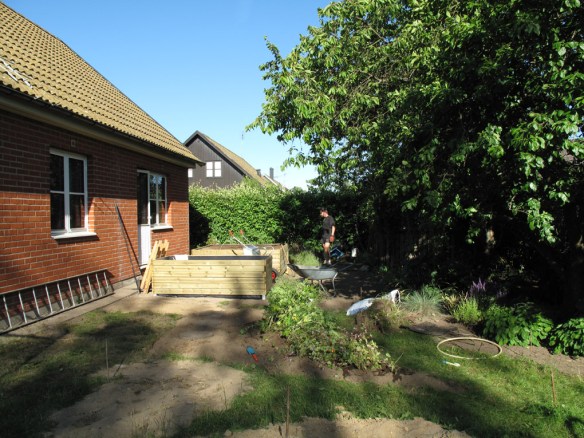 2011. Arbete pågår. Maken har snickrat tre av fyra bäddar. Nu måste rosorna flyttas en meter för att lämna plats för den sista lådan.