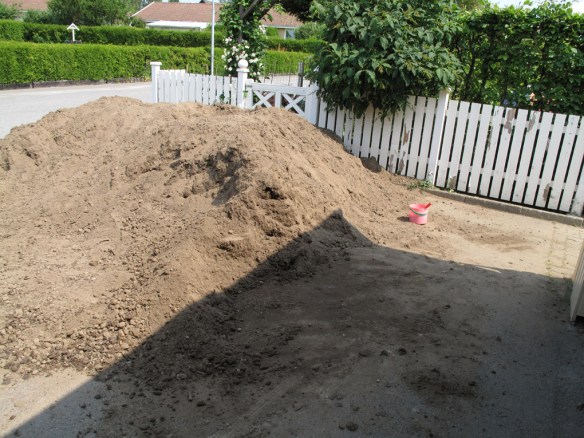 Jorden kanske någon undrar över. Den beställde vi från en lokal firma som kom med ett lass fin sållad matjord. Vi körde in den med skottkärra i trädgården lass för lass… Ja, ni som har följt tidigare delar vet ju att i vår trädgård kommer man inte in med några maskiner! När man beställer jord gäller det att beställa rätt så man inte får ”skitjord”.