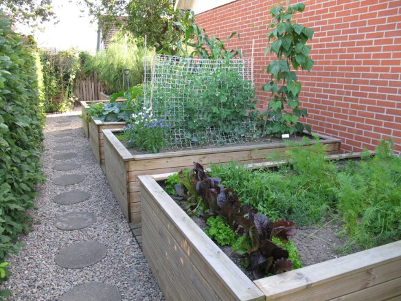 När vi flyttade in 1999 fanns inget trädgårdsland och så kunde vi ju inte ha det! Redan andra året flyttade vi odlingarna till den smala remsan på husets östersida och var tillräckligt nöjda med resultatet för att låta odlingen vara kvar. Första året odlade vi i marknivå, de följande åren i pallkragar. När de började ge upp efter en handfull år beslöt vi oss för att bygga stora, rejäla upphöjda bäddar närmast huset för att slippa skuggan från häcken.