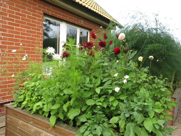 Utöver de fyra upphöjda lådorna till grönsaker och de två sparrisbäddarna så byggde vi även en liten bädd som mest används till sommarblommor för snitt, här ovan olika dahlior och rosenskära. I bakgrunden syns en mörkgrön sparrisvägg.