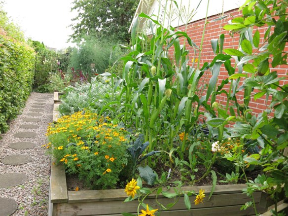 Tvärt emot vad man skulle kunna tro kan det fungera att ha grönsaksodlingarna i österläge. Om man som vi har en skyddande tegelvägg bakom som håller kvar värmen, en häck som ger vindskydd och upphöjda bäddar som ger bra odlingsmöjligheter tidigt på året.